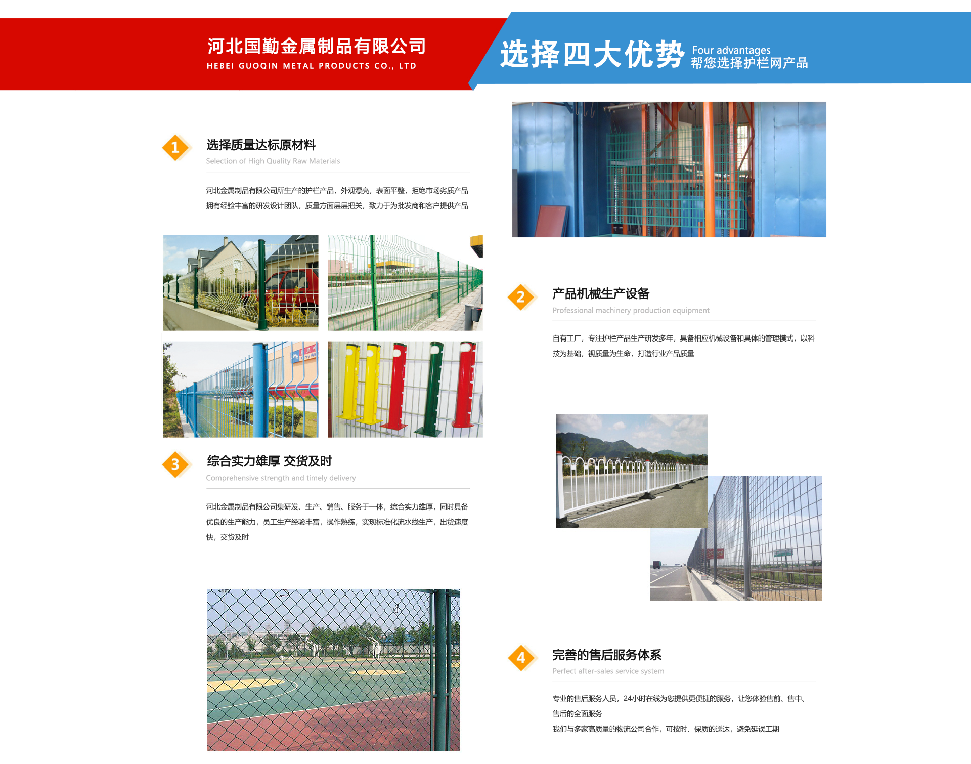 河北國勤金屬制品有限公司位于亞洲較大的絲網(wǎng)生產(chǎn)基地--享譽世界的“中國絲網(wǎng)之鄉(xiāng)”美譽的河北省安平縣境內。主要是以研發(fā)設計、制造生產(chǎn)、銷售服務于一體的高科技現(xiàn)代化企業(yè)。河北國勤金屬制品有限公司主營產(chǎn)品有護欄網(wǎng),隔離網(wǎng),市政工程,草坪護欄等各種系列產(chǎn)品的制造廠家。我廠產(chǎn)品被廣泛應用于公路、石化、化工、港口、合金、電力、造紙、鋼鐵、建材、市政、石油、污水處理及一般工業(yè)廠房、市政建設等各個領域。公司自成立以來一直為客戶提供優(yōu)良,貼心的服務。從售前售中售后我們都以客戶為導向,以設計先進、高科技手段、價格低質量優(yōu)等多方面為客戶提供整體全面的服務。我們相信科技創(chuàng)新的力量,本廠在產(chǎn)品技術基礎上不斷探索與創(chuàng)新,力求以更高品質的產(chǎn)品、更合理的價格、更完善的售后服務、不斷豐富的產(chǎn)品線滿足于每一位客戶的需求。